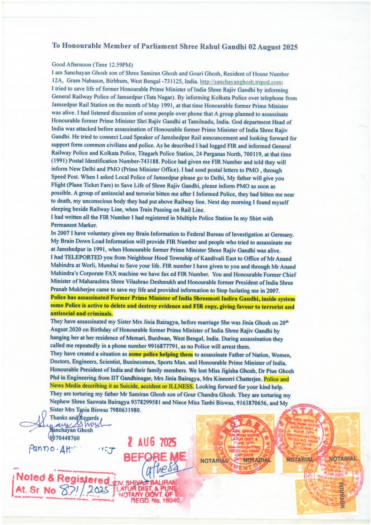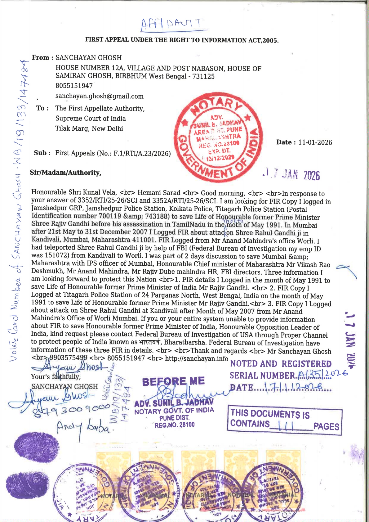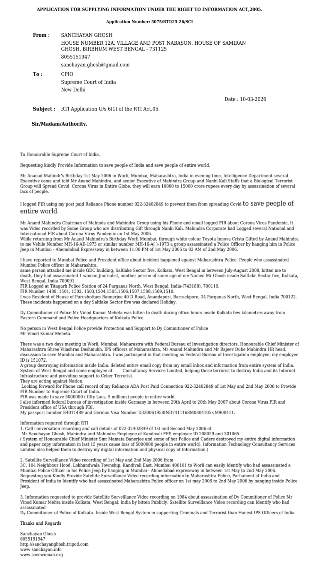 Mr Sachin Ramesh Tendulkar, Mr Sourav Ganguly providing time for me. I thank you Honourable Respected Member of Parliament Opposition Leader Shree Rahul Gandhi ji providing time for me in 2007 Mumbai. I thank you Honourable former President of Varatbarsha Shree Pranab Mukherjee providing time for me in Mumbai 2007. I thank you Honourable former Chief Minister of West Bengal Shree Buddhadeb Bhattacharjee & Honourable former Chief Minister of Maharashtra Shree Vikash Rao Deshmukh ji for providing time for me. I have registered domain name in multiple field.